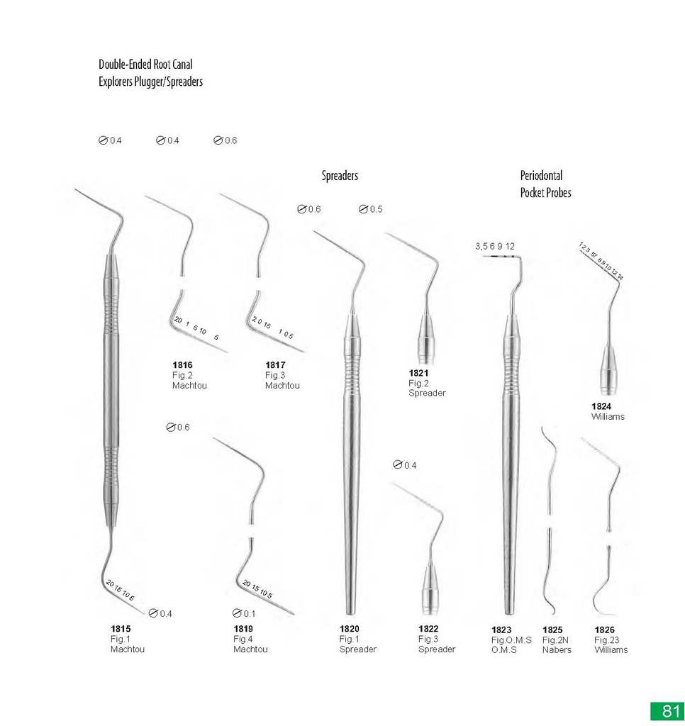 Double-Ended Root Canal Explorers Plugger/Spreaders Spreaders Periodontal Pocket Probes 3,5 6 9 12 1816 1817 Fig.2 Machtou Fig.3 Machtou 1821 Fig.2 Spreader 1824 Williams 1815 1819 1820 1822 1823 1825 1826 Fig.1 Fig.4 Fig.1 Fig.3 Fig.O.M.S Fig.2N Fig.23Machtou Machtou Spreader Spreader O.M.S Nabers Williams