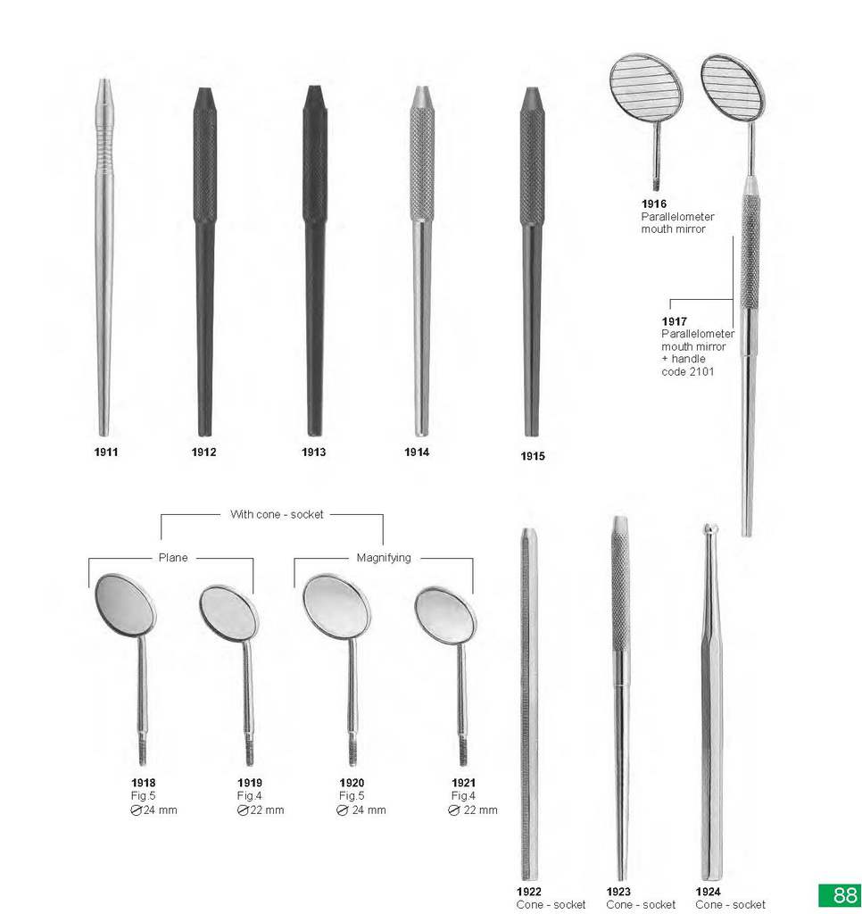 Parallelometer mouth mirror + handle code 2101 1911 1912 1913 1914 1915 With cone – socket Plane Magnifying 1918 1919 1920 1921 24 mm 22 mm 1922 1923 1924 Cone – socket Cone – socket Cone – socket