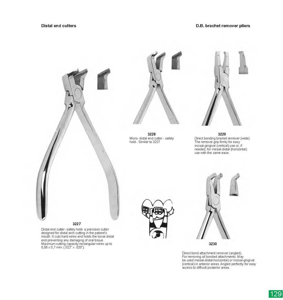 Distal end cutters 3227 Distal end cutter -safety hold- a precision cutter designed for distal arch cutting in the patient?s mouth. It cuts hard wires end holds the loose distal end preventing any damaging of oral tissue. Maximum cutting capacity rectangular wires up to 0,56 x 0,7 mm. (.022? x .020?). 3228 Micro- distal end cutter – safety hold-. Similar to 3227 D.B. brachet remover pliers 3229 Direct bonding bracket remover (wide). The removal grip firmly for easy incisal-gingival (vertical) use or, if needed, for mesial-distal (horizontal) use with the same ease. 3230 Direct bond attachment remover (angled). For removing all bonded attachments. May be used mesial-distal-horizontal) or incisal-gingival (vertical) in anterior areas. Angled perfectly for easy access to difficult posterior areas.
