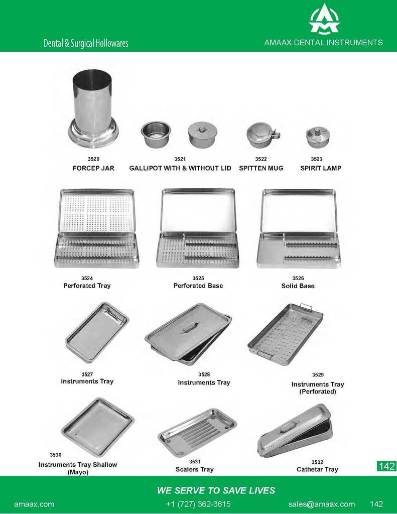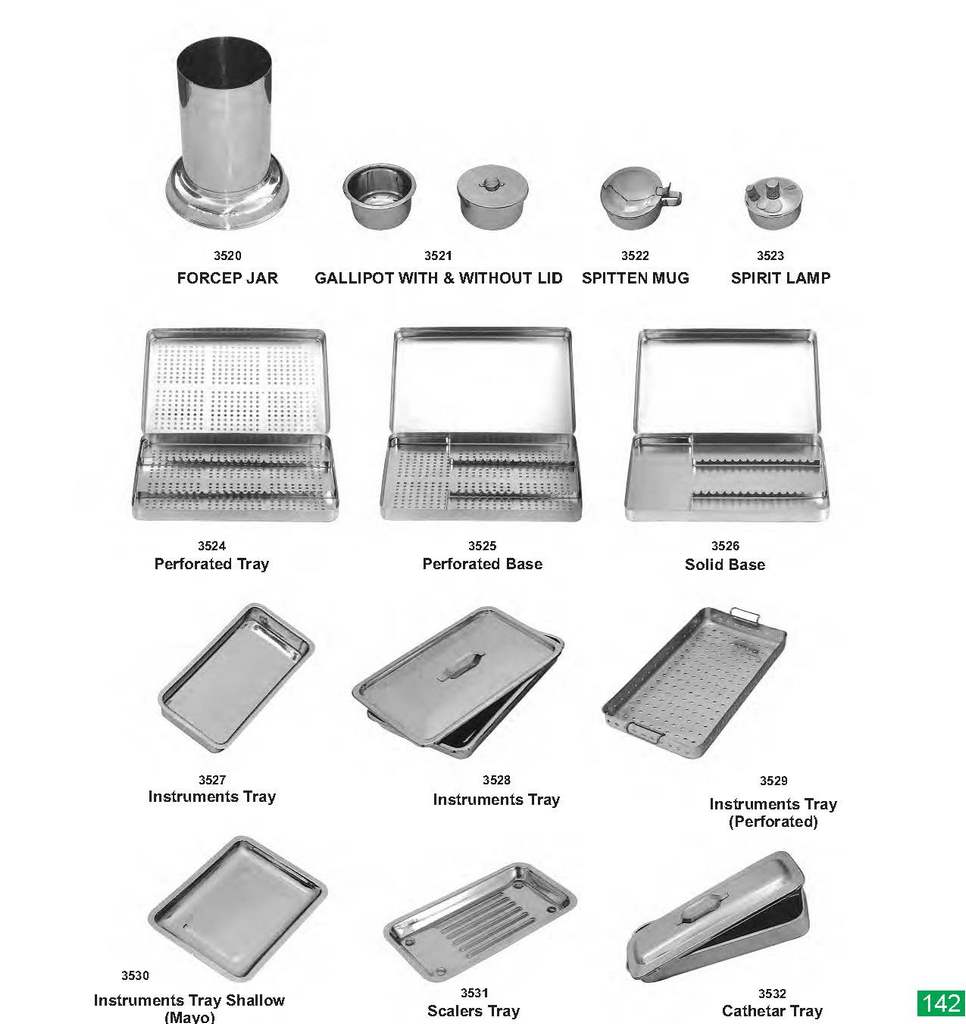 3520 3521 3522 3523 FORCEP JAR GALLIPOT WITH & WITHOUT LID SPITTEN MUG SPIRIT LAMP 3524 3525 3526 Perforated Tray Perforated Base Solid Base 3527 3528 3529 Instruments Tray Instruments Tray Instruments Tray (Perforated) 3530 3531 3532 Instruments Tray Shallow Scalers Tray Cathetar Tray (Mayo)