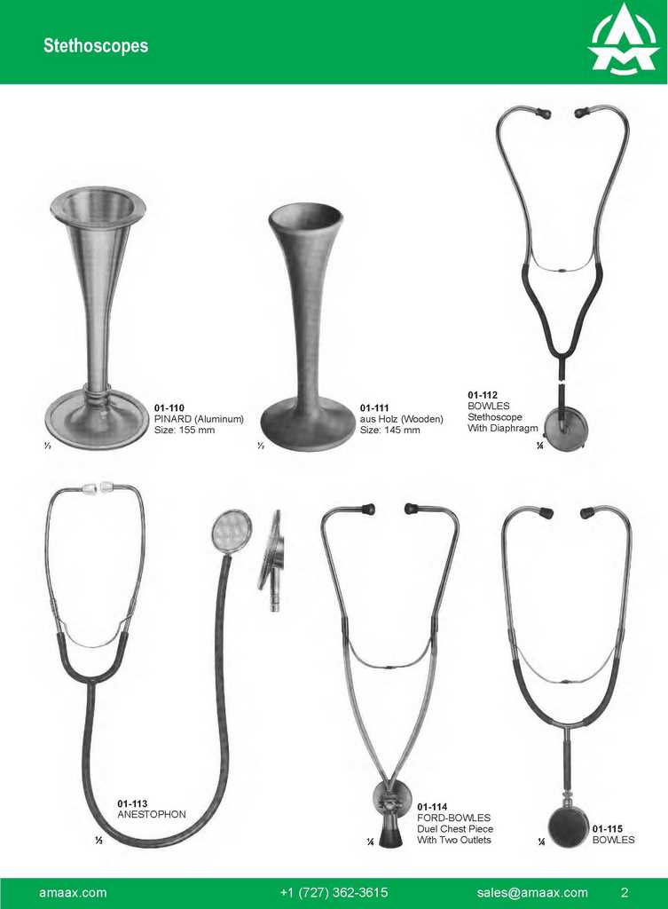 01-110 PINARD (Aluminum) Size: 155 mm ? 01-112 BOWLES Stethoscope With Diaphragm 01-113 ANESTOPHON 01-114 FORD-BOWLES Duel Chest Piece With Two Outlets 01-115 BOWLES 01-111 aus Holz (Wooden) Size: 145 mm INSTRUMENTS R 2