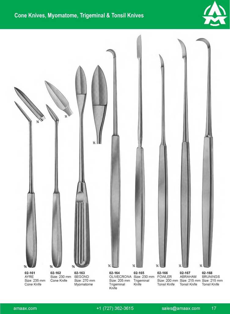 AYRE Size: 235 mm Cone Knife 02-162 Size: 230 mm Cone Knife 02-163 SEGOND Size: 270 mm Myomatome 02-164 OLIVECRONA Size: 205 mm Trigeminal Knife 02-165 Size: 230 mm Trigeminal Knife 02-166 FOWLER Size: 200 mm Tonsil Knife 02-167 ABRAHAM Size: 215 mm Tonsil Knife 02-168 BRUNINGS Size: 215 mm Tonsil Knife