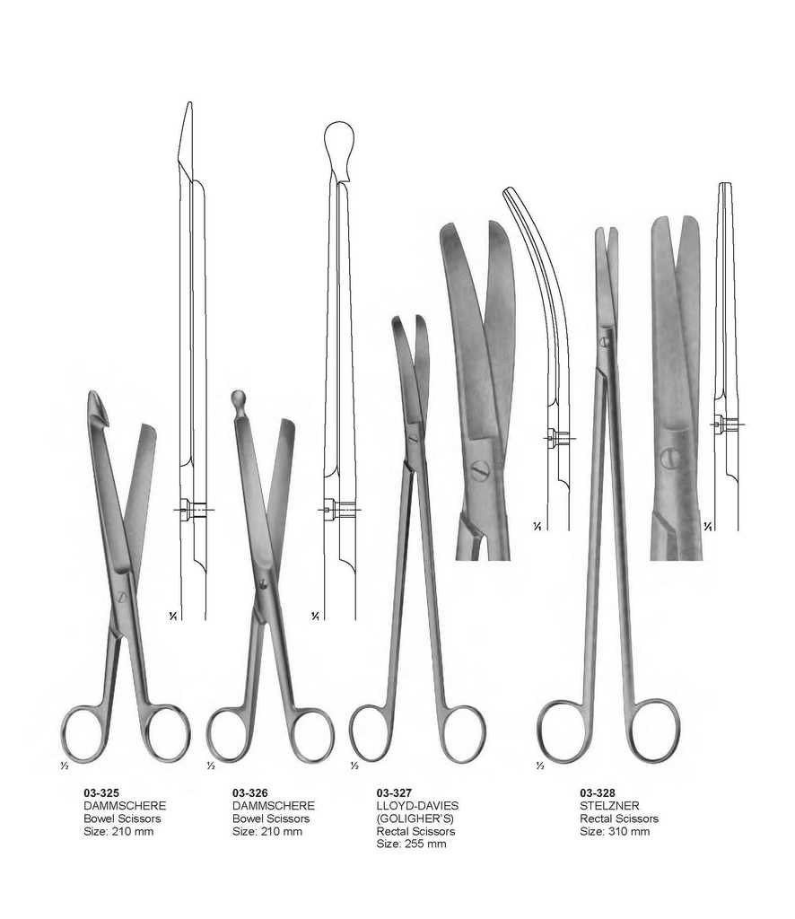 03-325 DAMMSCHERE Bowel Scissors Size: 210 mm 03-326 DAMMSCHERE Bowel Scissors Size: 210 mm 03-327 LLOYD-DAVIES (GOLIGHER?S) Rectal Scissors Size: 255 mm 03-328 STELZNER Rectal Scissors Size: 310 mm ? ? INSTRUMENTS R 46