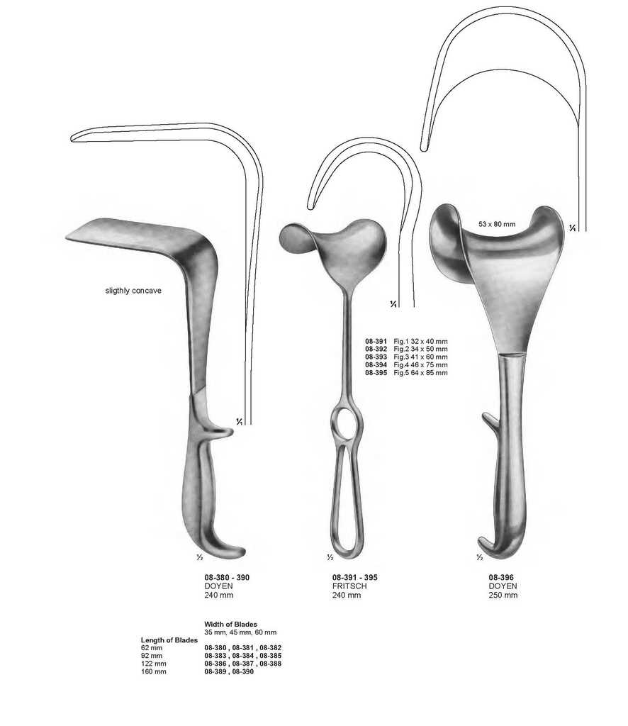 08-380 – 390 DOYEN 240 mm Width of Blades 35 mm, 45 mm, 60 mm 08-380 , 08-381 , 08-382 08-383 , 08-384 , 08-385 08-386 , 08-387 , 08-388 08-389 , 08-390 Length of Blades 62 mm 92 mm 122 mm 160 mm 08-391 – 395 FRITSCH 240 mm 08-391 Fig.1 32 x 40 mm 08-392 Fig.2 34 x 50 mm 08-393 Fig.3 41 x 60 mm 08-394 Fig.4 46 x 75 mm 08-395 Fig.5 64 x 85 mm 08-396 DOYEN 250 mm sligthly concave ?INSTRUMENTS R 144