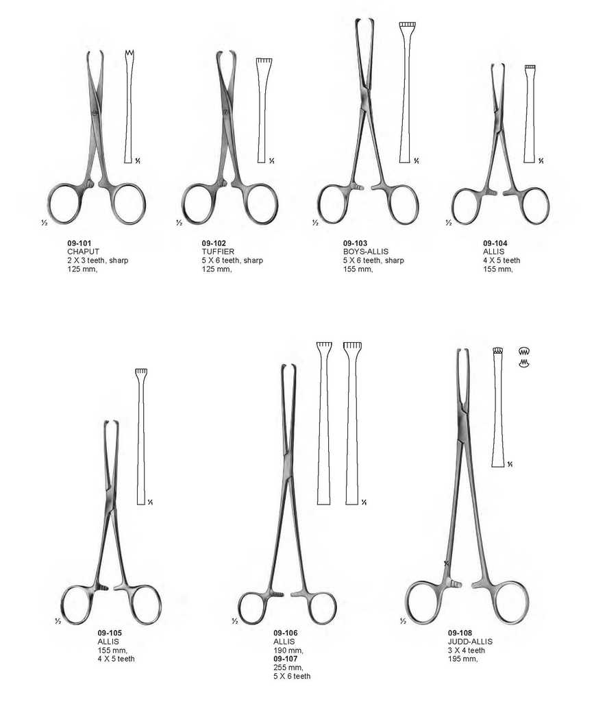 09-101 CHAPUT 2 X 3 teeth, sharp 125 mm, 09-102 TUFFIER 5 X 6 teeth, sharp 125 mm, 09-103 BOYS-ALLIS 5 X 6 teeth, sharp 155 mm, 09-104 ALLIS 4 X 5 teeth 155 mm, 09-108 JUDD-ALLIS 3 X 4 teeth 195 mm, 09-106 ALLIS 190 mm, 09-107 255 mm, 5 X 6 teeth 09-105 ALLIS 155 mm, 4 X 5 teeth INSTRUMENTS R 166
