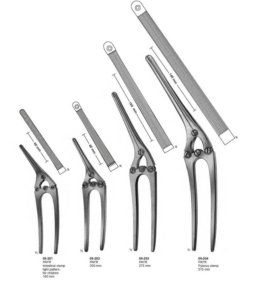 09-201 PAYR Intestinal clamp light pattern, for children 180 mm 09-202 PAYR 200 mm 09-203 PAYR 275 mm 09-204 PAYR Pylorus clamp 315 mm 66 mm 68 mm 80 m 1 m 14 mm 6 INSTRUMENTS R 181