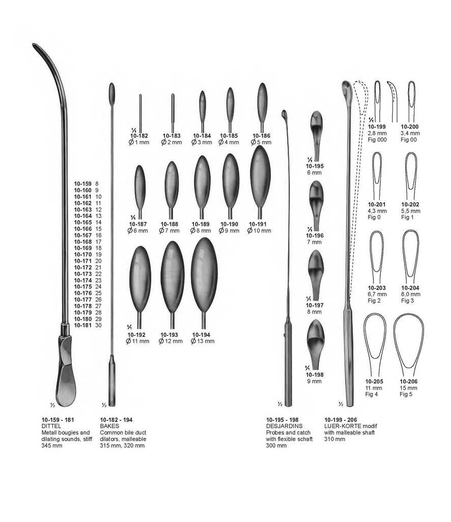 10-159 – 181 DITTEL Metall bougies and dilating sounds, stiff 345 mm ? 10-159 8 10-160 9 10-161 10 10-162 11 10-163 12 10-164 13 10-165 14 10-166 15 10-167 16 10-168 17 10-169 18 10-170 19 10-171 20 10-172 21 10-173 22 10-174 23 10-175 24 10-176 25 10-177 26 10-178 27 10-179 28 10-180 29 10-181 30 10-182 – 194 BAKES Common bile duct dilators, malleable 315 mm, 320 mm ? 10-182 1 mm 10-183 2 mm 10-184 3 mm 10-185 4 mm 10-186 5 mm 10-187 6 mm 10-188 7 mm 10-189 8 mm 10-190 9 mm 10-191 10 mm 10-192 11 mm 10-193 12 mm 10-194 13 mm 10-195 – 198 DESJARDINS Probes and catch with flexible schaft 300 mm ? 10-195 6 mm 10-196 7 mm 10-197 8 mm 10-198 9 mm 10-199 – 206 LUER-KORTE modif with malleable shaft 310 mm ? 10-199 2,8 mm Fig 000 10-200 3,4 mm Fig 00 10-201 4,3 mm Fig 0 10-202 5,5 mm Fig 1 10-203 6,7 mm Fig 2 10-204 8,0 mm Fig 3 10-205 11 mm Fig 4 10-206 15 mm Fig 5 INSTRUMENTS R 196