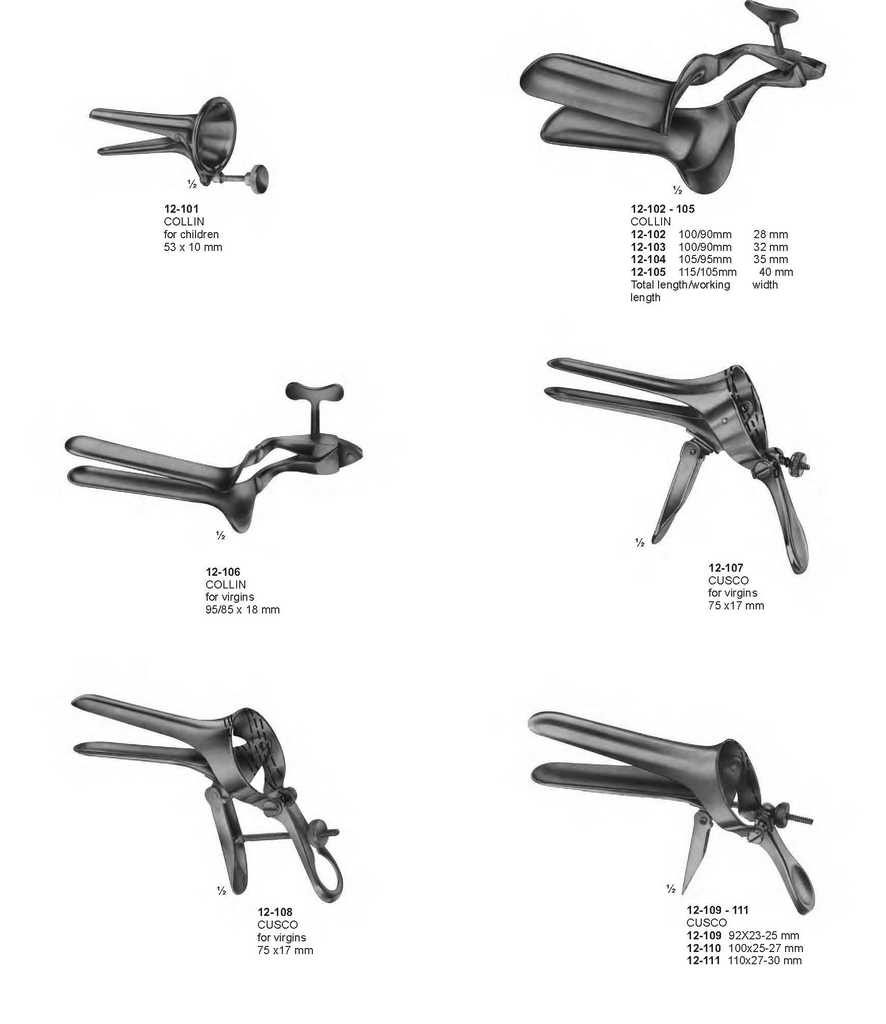 12-101 COLLIN for children 53 x 10 mm 12-102 – 105 COLLIN 12-102 100/90mm 28 mm 12-103 100/90mm 32 mm 12-104 105/95mm 35 mm 12-105 115/105mm 40 mm Total length/working width length 12-106 COLLIN for virgins 95/85 x 18 mm ? 12-107 CUSCO for virgins 75 x17 mm 12-108 CUSCO for virgins 75 x17 mm 12-109 – 111 CUSCO 12-109 92X23-25 mm 12-110 100×25-27 mm 12-111 110×27-30 mm INSTRUMENTS R 207