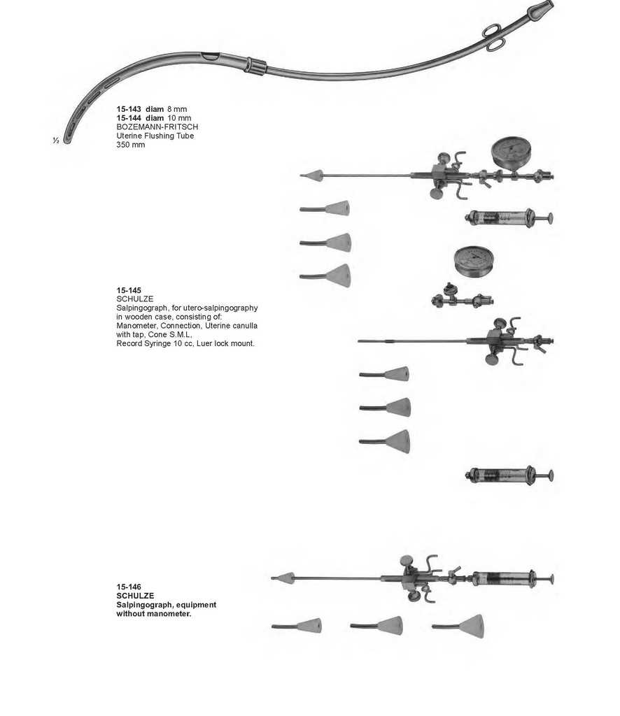 15-143 diam 8 mm 15-144 diam 10 mm BOZEMANN-FRITSCH Uterine Flushing Tube 350 mm 15-145 SCHULZE Salpingograph, for utero-salpingography in wooden case, consisting of: Manometer, Connection, Uterine canulla with tap, Cone S.M.L, Record Syringe 10 cc, Luer lock mount. 15-146 SCHULZE Salpingograph, equipment without manometer. INSTRUMENTS R 243