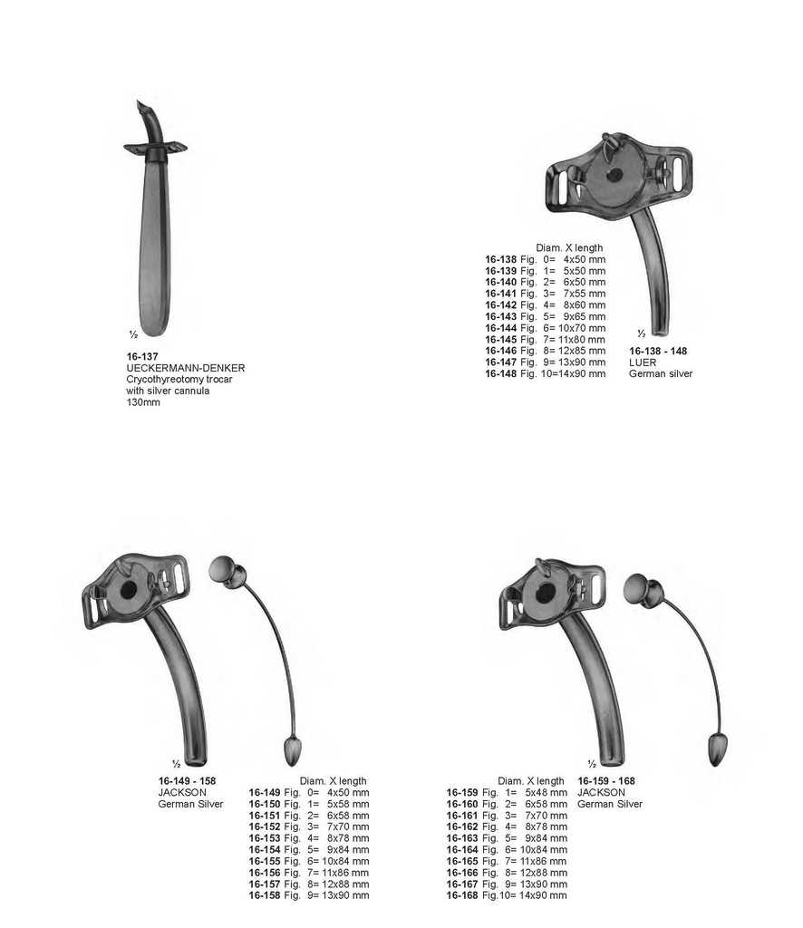 16-137 UECKERMANN-DENKER Crycothyreotomy trocar with silver cannula 130mm 16-138 – 148 LUER German silver 16-149 – 158 JACKSON German Silver Diam. X length 16-149 Fig. 0= 4×50 mm 16-150 Fig. 1= 5×58 mm 16-151 Fig. 2= 6×58 mm 16-152 Fig. 3= 7×70 mm 16-153 Fig. 4= 8×78 mm 16-154 Fig. 5= 9×84 mm 16-155 Fig. 6= 10×84 mm 16-156 Fig. 7= 11×86 mm 16-157 Fig. 8= 12×88 mm 16-158 Fig. 9= 13×90 mm Diam. X length 16-138 Fig. 0= 4×50 mm 16-139 Fig. 1= 5×50 mm 16-140 Fig. 2= 6×50 mm 16-141 Fig. 3= 7×55 mm 16-142 Fig. 4= 8×60 mm 16-143 Fig. 5= 9×65 mm 16-144 Fig. 6= 10×70 mm 16-145 Fig. 7= 11×80 mm 16-146 Fig. 8= 12×85 mm 16-147 Fig. 9= 13×90 mm 16-148 Fig. 10=14×90 mm 16-159 – 168 JACKSON German Silver ? Diam. X length 16-159 Fig. 1= 5×48 mm 16-160 Fig. 2= 6×58 mm 16-161 Fig. 3= 7×70 mm 16-162 Fig. 4= 8×78 mm 16-163 Fig. 5= 9×84 mm 16-164 Fig. 6= 10×84 mm 16-165 Fig. 7= 11×86 mm 16-166 Fig. 8= 12×88 mm 16-167 Fig. 9= 13×90 mm 16-168 Fig.10= 14×90 mm INSTRUMENTS R 253