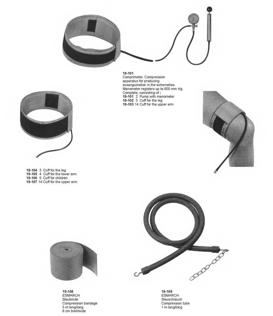 19-101 Comprimeter. Compression apparatus for producing exsanguination in the extremeties. Manometer registers up to 600 mm Hg. Complete, consisting of : 19-101 2 Pump with manometer 19-102 3 Cuff for the leg 19-103 14 Cuff for the upper arm 19-104 3 Cuff for the leg 19-105 4 Cuff for the lower arm 19-106 5 Cuff for children 19-107 14 Cuff for the upper arm 19-108 ESMARCH Staubinde Compression bandage 5 m lang/long 6 cm breit/wide 19-109 ESMARCH Stauschlauch Compression tube 1 m lang/long INSTRUMENTS R 317