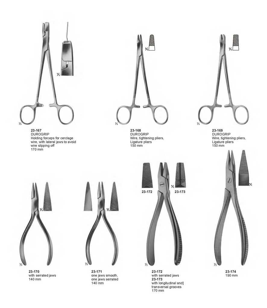 DUROGRIP Holding forceps for cerclage wire, with lateral jaws to avoid wire silpping off 170 mm 23-168 DUROGRIP Wire, tightening pliers, Ligature pliers 150 mm 23-169 DUROGRIP Wire, tightening pliers, Ligature pliers 150 mm 23-170 with serrated jaws 140 mm 23-171 one jaws smooth, one jaws serrated 140 mm 23-172 with serrated jaws 23-173 with longitudinal and] transversal grooves 170 mm 23-174 190 mm 23-172 23-173 386