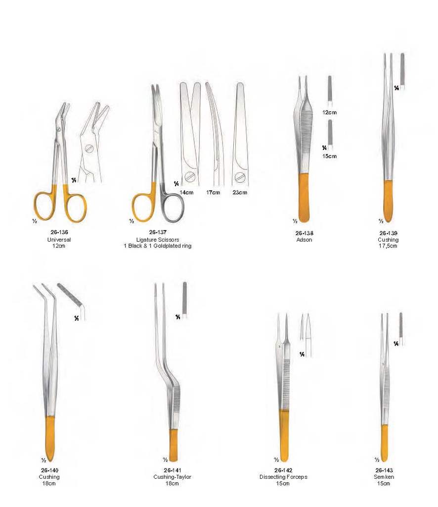 26-136 Universal 12cm 14cm 17cm 23cm 26-138 Adson 26-137 12cm 15cm 26-139 Cushing 17,5cm 26-140 Cushing 18cm 26-141 Cushing-Taylor 18cm 26-142 Dissecting Forceps 15cm 26-143 Semken 15cm Scissors & Dissecting Forceps with Tungsten Carbide Inserts Ligature Scissors 1 Black & 1 Goldplated ring
