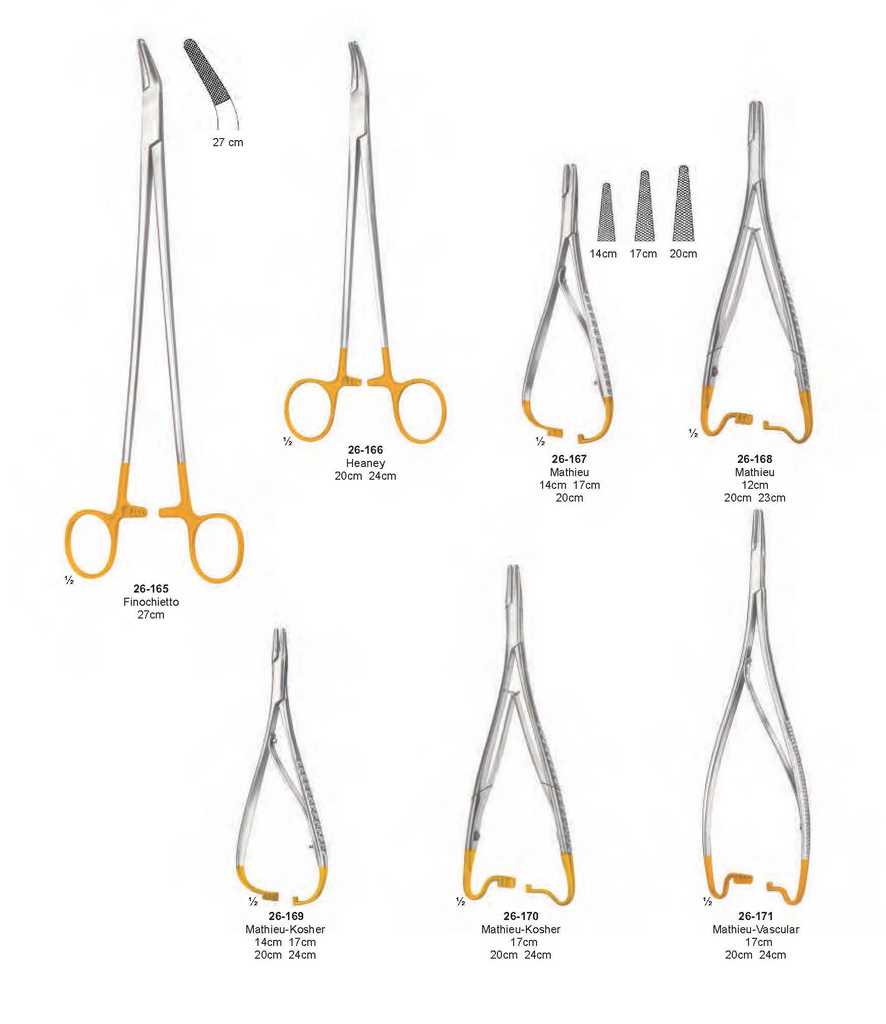 26-165 Finochietto 27cm 26-166 Heaney 20cm 24cm 26-167 Mathieu 14cm 17cm 20cm 26-168 Mathieu 12cm 20cm 23cm 26-169 Mathieu-Kosher 14cm 17cm 20cm 24cm 26-170 Mathieu-Kosher 17cm 20cm 24cm 26-171 Mathieu-Vascular 17cm 20cm 24cm Needle holders with Tungsten Carbide Inserts 14cm 17cm 20cm 27 cm INSTRUMENTS R 415