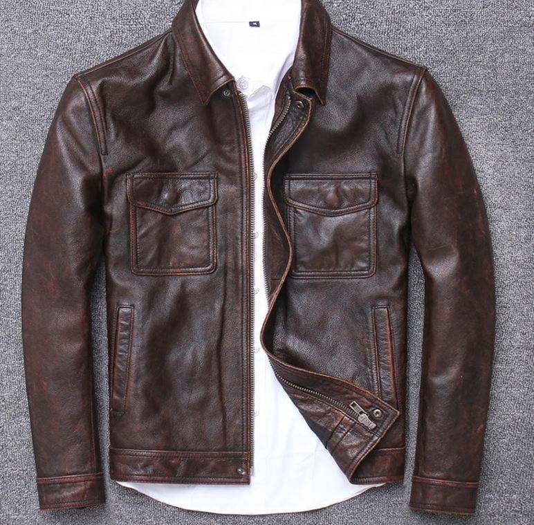 Mens Genuine Leather Jacket Biker Motorcycle Retro Classic Cafe Racer Vintage Leather Brown