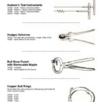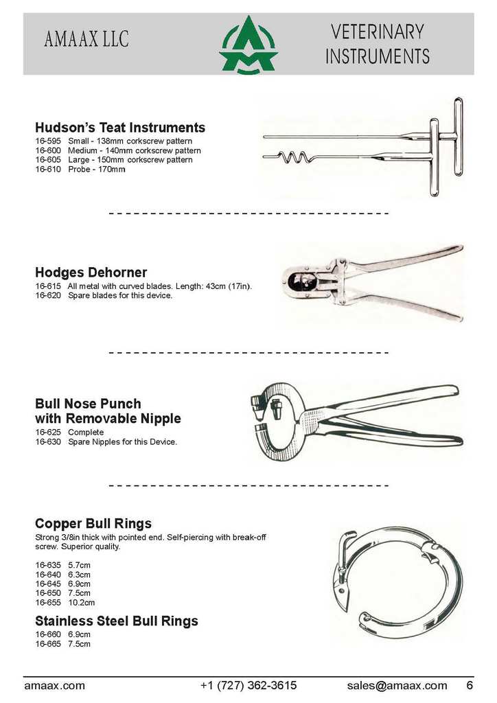 Hudson?s Teat Instruments 16-595 Small -138mm corkscrew pattern 16-600 Medium -140mm corkscrew pattern 16-605 Large -150mm corkscrew pattern 16-610 Probe -170mm Hodges Dehorner 16-615 All metal with curved blades. Length: 43cm (17in). 16-620 Spare blades for this device. Bull Nose Punch with Removable Nipple 16-625 Complete 16-630 Spare Nipples for this Device. Copper Bull Rings Strong 3/8in thick with pointed end. Self-piercing with break-off screw. Superior quality. 16-635 5.7cm 16-640 6.3cm 16-645 6.9cm 16-650 7.5cm 16-655 10.2cm Stainless Steel Bull Rings 16-660 6.9cm 16-665 7.5cm