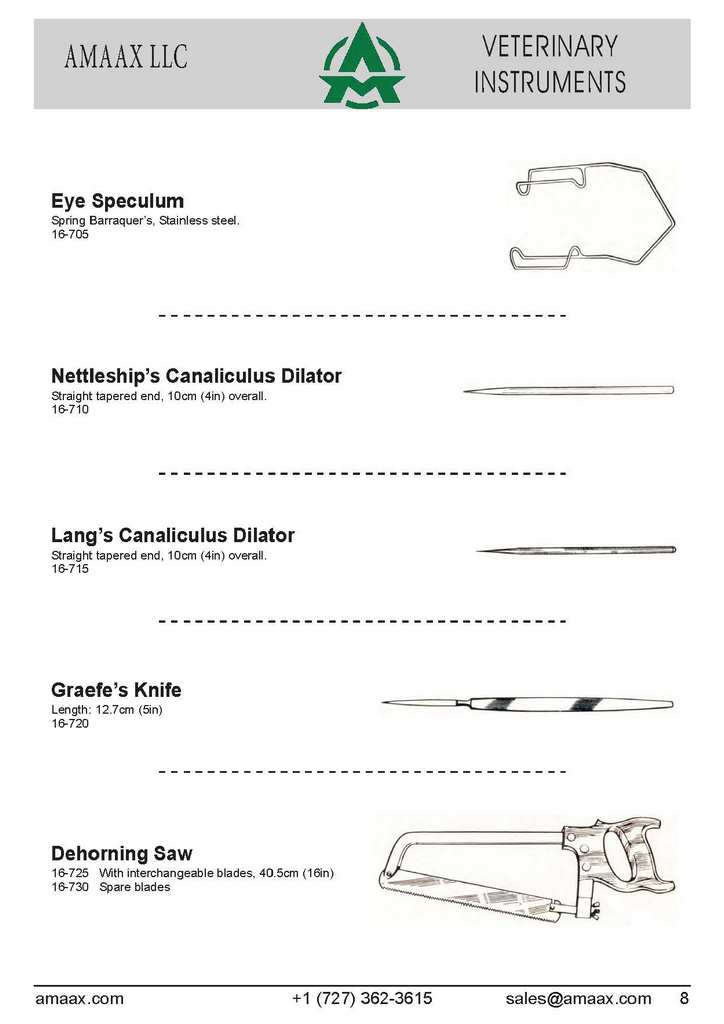 Eye Speculum Spring Barraquer?s, Stainless steel. 16-705 Nettleship?s Canaliculus Dilator Straight tapered end, 10cm (4in) overall. 16-710 Lang?s Canaliculus Dilator Straight tapered end, 10cm (4in) overall. 16-715 Graefe?s Knife Length: 12.7cm (5in) 16-720 Dehorning Saw 16-725 With interchangeable blades, 40.5cm (16in) 16-730 Spare blades