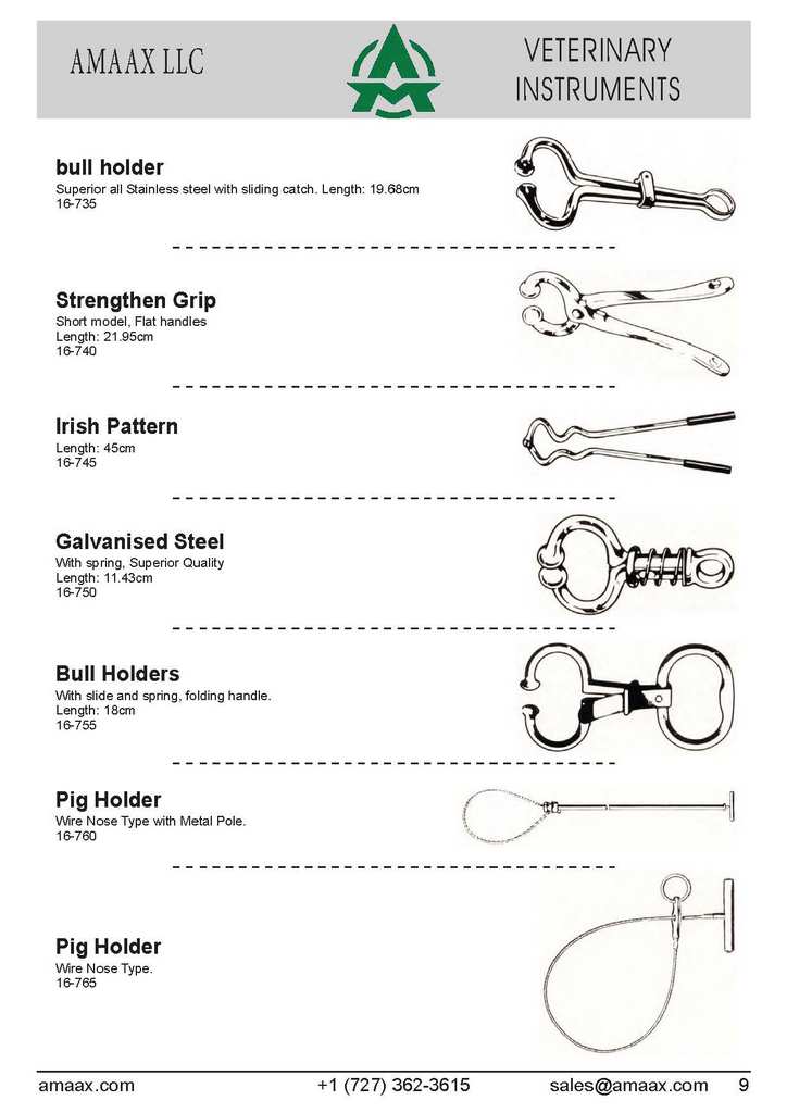 bull holder Superior all Stainless steel with sliding catch. Length: 19.68cm 16-735 Strengthen Grip Short model, Flat handles Length: 21.95cm 16-740 Irish Pattern Length: 45cm 16-745 Galvanised Steel With spring, Superior Quality Length: 11.43cm 16-750 Bull Holders With slide and spring, folding handle. Length: 18cm 16-755 Pig Holder Wire Nose Type with Metal Pole. 16-760 Pig Holder Wire Nose Type. 16-765