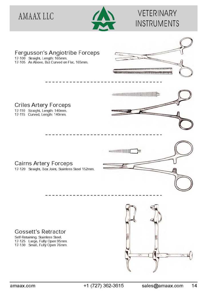 Fergusson?s Angiotribe Forceps 17-100 Straight, Length: 165mm. 17-105 As Above, But Curved on Flat, 165mm. Criles Artery Forceps 17-110 Straight, Length: 140mm. 17-115 Curved, Length: 140mm. Cairns Artery Forceps 17-120 Straight, Box Joint, Stainless Steel 152mm. Gossett?s Retractor Self-Retaining, Stainless Steel. 17-125 Large, Fully Open 95mm. 17-130 Small, Fully Open 76mm.