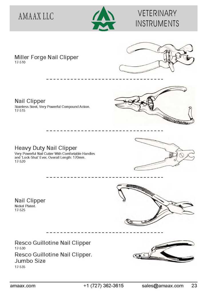 Miller Forge Nail Clipper 17-510 Nail Clipper Stainless Steel, Very Powerful Compound Action. 17-515 Heavy Duty Nail Clipper Very Powerful Nail Cutter With Comfortable Handles and ?Lock-Shut? Ever, Overall Length: 170mm. 17-520 Nail Clipper Nickel Plated. 17-525 Resco Guillotine Nail Clipper 17-530 Resco Guillotine Nail Clipper. Jumbo Size 17-535
