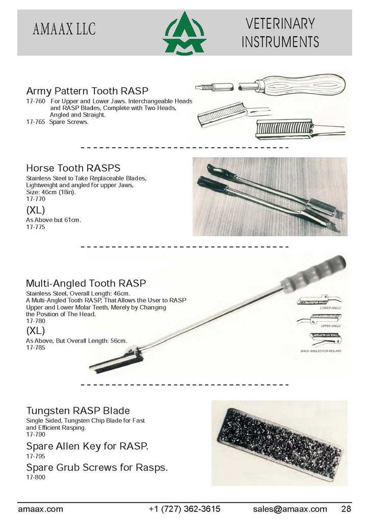 Army Pattern Tooth RASP 17-760 For Upper and Lower Jaws. Interchangeable Heads and RASP Blades, Complete with Two Heads, Angled and Straight. 17-765 Spare Screws. Horse Tooth RASPS Stainless Steel to Take Replaceable Blades, Lightweight and angled for upper Jaws, Size: 46cm (18in). 17-770 (XL) As Above but 61cm. 17-775 17-785 Tungsten RASP Blade Single Sided, Tungsten Chip Blade for Fast and Efficient Rasping. 17-790 Spare Allen Key for RASP. 17-795 Spare Grub Screws for Rasps. 17-800