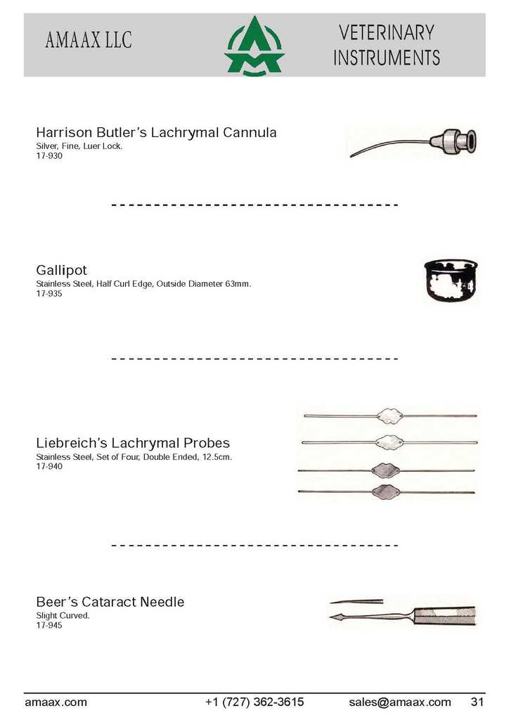 Harrison Butler?s Lachrymal Cannula Silver, Fine, Luer Lock. 17-930 Gallipot Stainless Steel, Half Curl Edge, Outside Diameter 63mm. 17-935 Liebreich?s Lachrymal Probes Stainless Steel, Set of Four, Double Ended, 12.5cm. 17-940 Beer?s Cataract Needle Slight Curved. 17-945