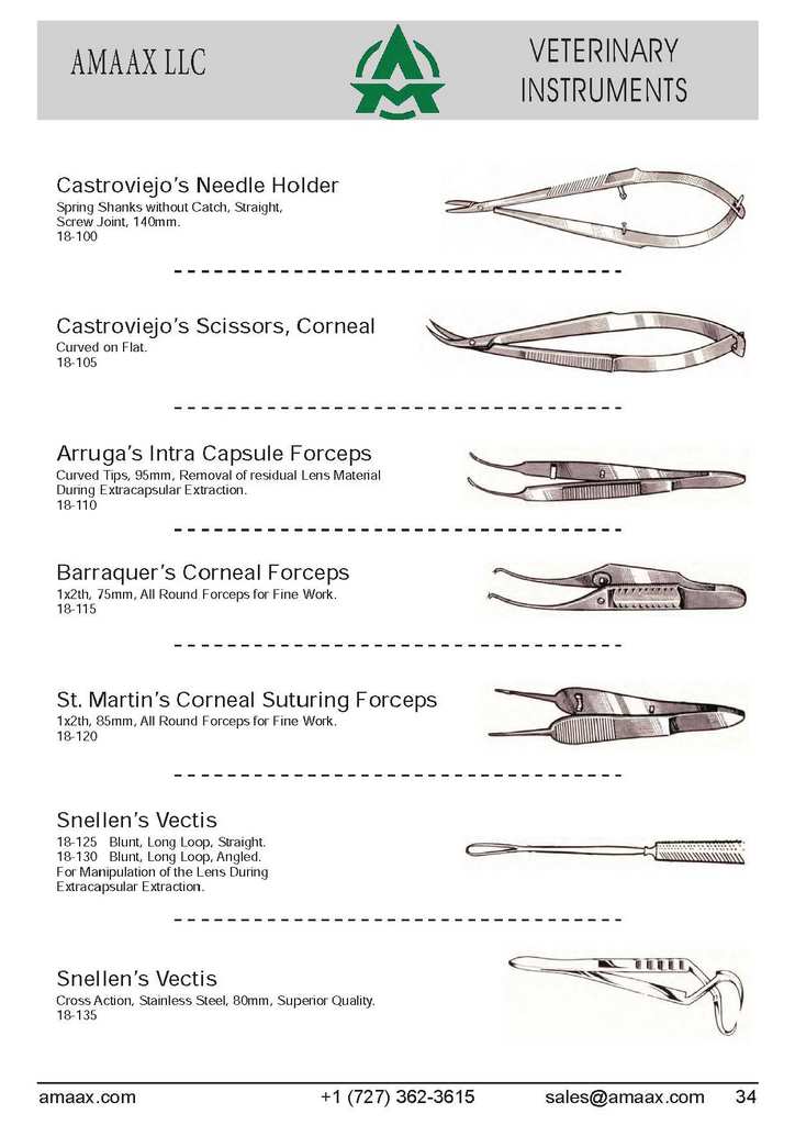 Castroviejo?s Needle Holder Spring Shanks without Catch, Straight, Screw Joint, 140mm. 18-100 Castroviejo?s Scissors, Corneal Curved on Flat. 18-105 Arruga?s Intra Capsule Forceps Curved Tips, 95mm, Removal of residual Lens Material During Extracapsular Extraction. 18-110 Barraquer?s Corneal Forceps 1x2th, 75mm, All Round Forceps for Fine Work. 18-115 St. Martin?s Corneal Suturing Forceps 1x2th, 85mm, All Round Forceps for Fine Work. 18-120 Snellen?s Vectis 18-125 Blunt, Long Loop, Straight. 18-130 Blunt, Long Loop, Angled. For Manipulation of the Lens During Extracapsular Extraction. Snellen?s Vectis Cross Action, Stainless Steel, 80mm, Superior Quality. 18-135