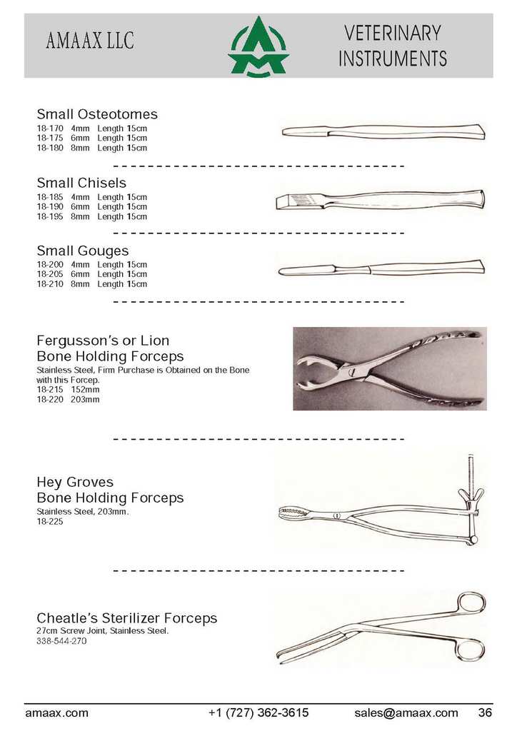 Small Osteotomes 18-170 4mm Length 15cm 18-175 6mm Length 15cm 18-180 8mm Length 15cm Small Chisels 18-185 4mm Length 15cm 18-190 6mm Length 15cm 18-195 8mm Length 15cm Small Gouges 18-200 4mm Length 15cm 18-205 6mm Length 15cm 18-210 8mm Length 15cm Fergusson?s or Lion Bone Holding Forceps Stainless Steel, Firm Purchase is Obtained on the Bone with this Forcep. 18-215 152mm 18-220 203mm Hey Groves Bone Holding Forceps Stainless Steel, 203mm. 18-225 Cheatle?s Sterilizer Forceps 27cm Screw Joint, Stainless Steel. 338-544-270