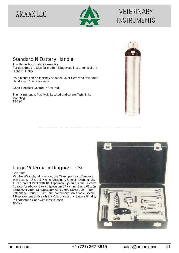 Standard N Battery Handle The Heine Automatic Connector For decades, the Sign for modern Diagnostic Instruments of the Highest Quality. Instruments can be Instantly Attached to, or Detached from their Handle with ?Fingertip? ease. Good Electrical Contact is Assured. The Instrument is Positively Located and cannot Twist in its Mounting. 18-320 Large Veterinary Diagnostic Set Contents Miroflex W2 Ophthalmoscope, Slit Otoscope Head Complete with Loupe, 1 Set = 5 Pieces, Veterinary Specula (Sanalon S), 1 Transparent Pack with 10 Disposable Specula, 4mm Diameter Adaptor for Above, Closed Speculum 57 x 4mm, Same 65 x 6mm, Same 90 x 7mm, Slit Speculum 65 x 6mm, Same 900 x 7mm, Veterinary-Tubus, 150 x 10mm, Veterinary Spreadable Speculum, 1 Replacement Bulb each 2.5 Volt. Standard N Battery Handle, In Leatherette Case with Plastic Insert. 18-325