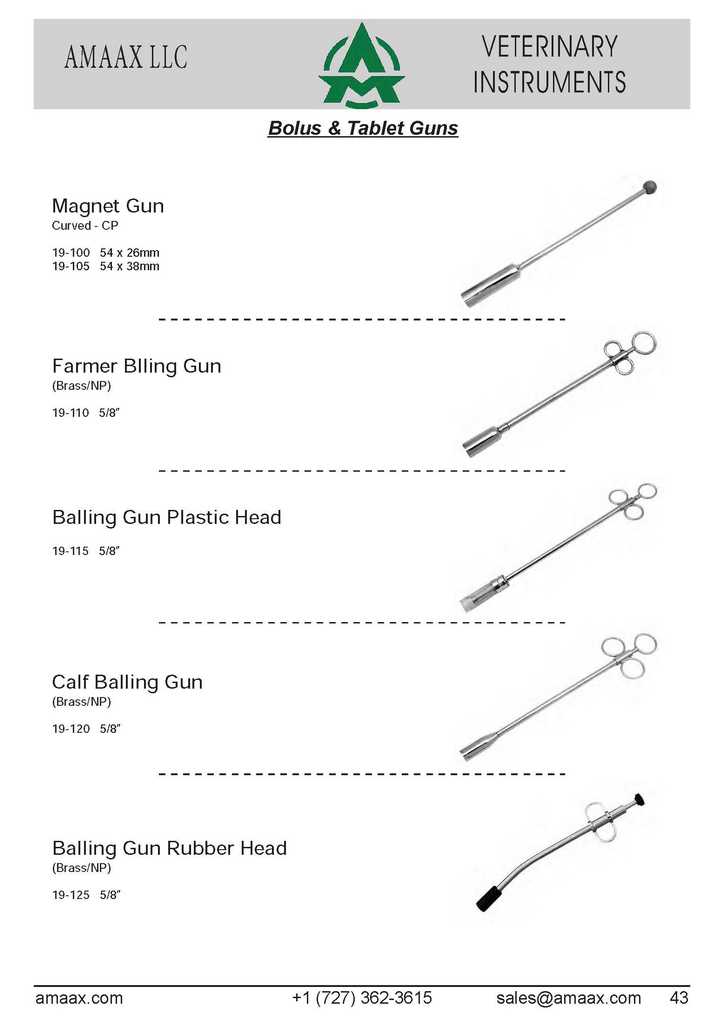 Bolus & Tablet Guns Magnet Gun Curved -CP 19-100 54 x 26mm 19-105 54 x 38mm Farmer Blling Gun (Brass/NP) 19-110 5/8? Balling Gun Plastic Head 19-115 5/8? Calf Balling Gun (Brass/NP) 19-120 5/8? Balling Gun Rubber Head (Brass/NP) 19-125 5/8?