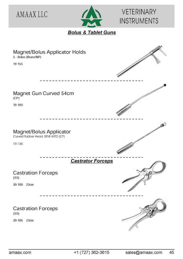 Bolus & Tablet Guns Magnet/Bolus Applicator Holds 5 -Bolus (Brass/NP) 19-155 Magnet Gun Curved 54cm (CP) 19-160 Magnet/Bolus Applicator Curved Rubber Head. SEMI AUTO (CP) 19-165 Castrator Forceps Castration Forceps (SS) 20-100 23cm Castration Forceps (SS) 20-105 23cm