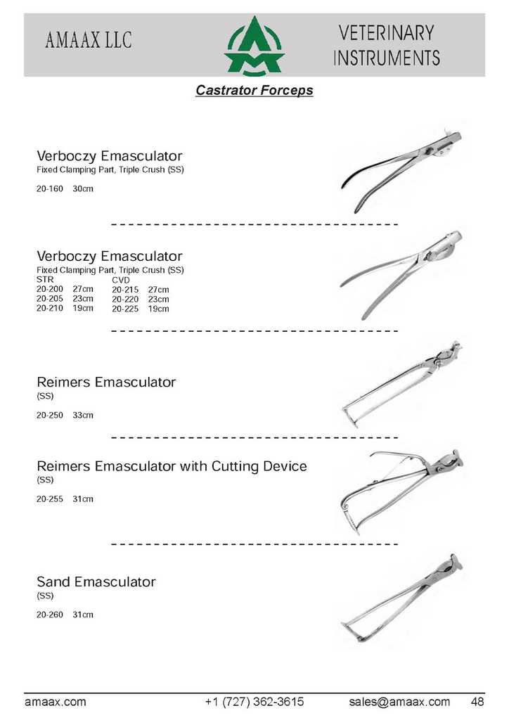 Castrator Forceps Verboczy Emasculator Fixed Clamping Part, Triple Crush (SS) 20-160 30cm Verboczy Emasculator Fixed Clamping Part, Triple Crush (SS) STR CVD 20-200 27cm 20-215 27cm 20-205 23cm 20-220 23cm 20-210 19cm 20-225 19cm Reimers Emasculator (SS) 20-250 33cm Reimers Emasculator with Cutting Device (SS) 20-255 31cm Sand Emasculator (SS) 20-260 31cm