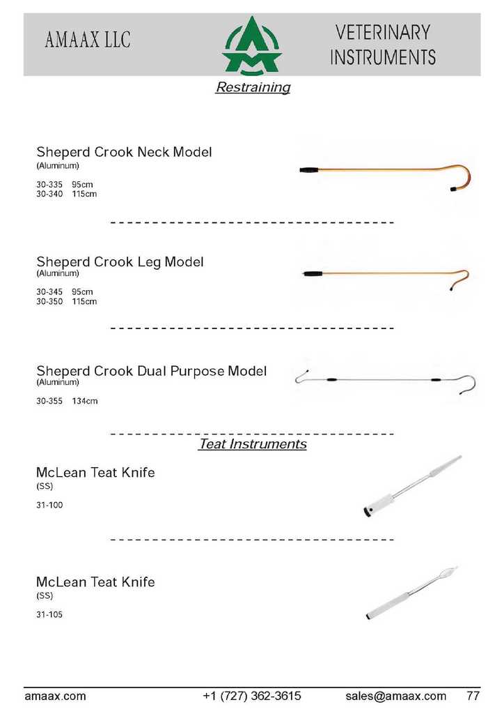 Restraining Sheperd Crook Neck Model (Aluminum) 30-335 95cm 30-340 115cm Sheperd Crook Leg Model (Aluminum) 30-345 95cm 30-350 115cm Sheperd Crook Dual Purpose Model (Aluminum) 30-355 134cm Teat Instruments McLean Teat Knife (SS) 31-100 McLean Teat Knife (SS) 31-105