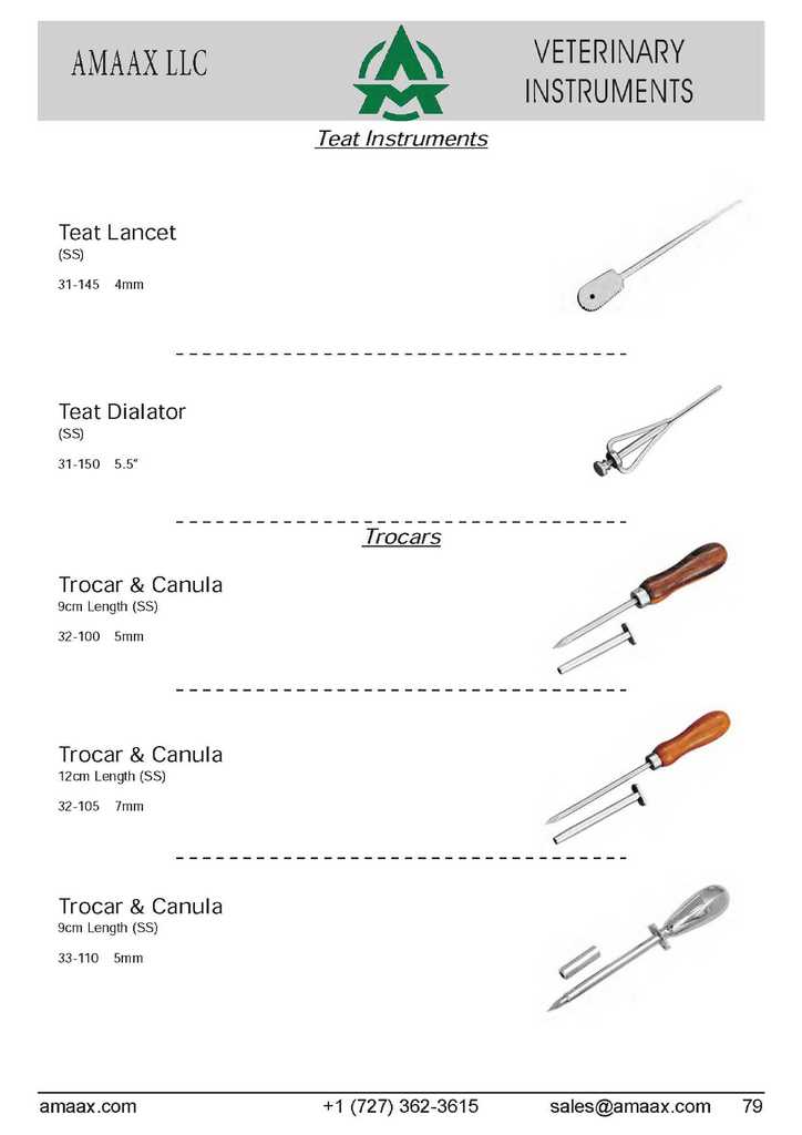 Teat Instruments Teat Lancet (SS) 31-145 4mm Teat Dialator (SS) 31-150 5.5? Trocars Trocar & Canula 9cm Length (SS) 32-100 5mm Trocar & Canula 12cm Length (SS) 32-105 7mm Trocar & Canula 9cm Length (SS) 33-110 5mm