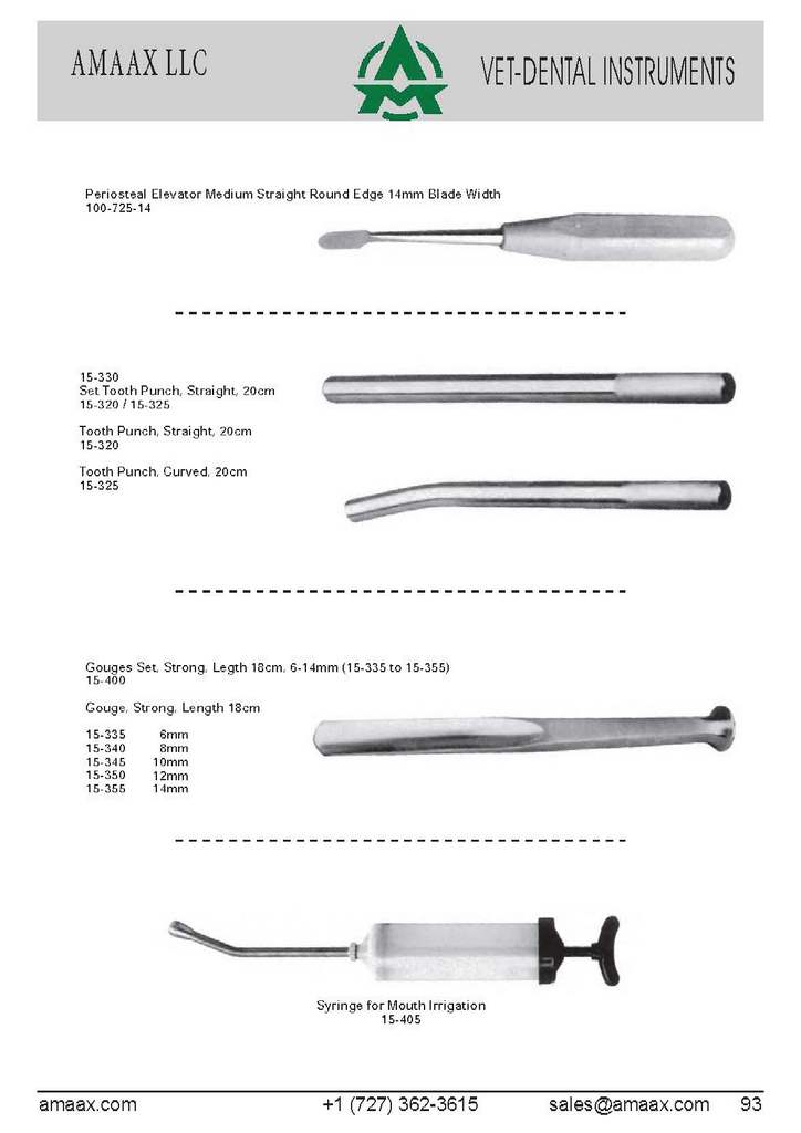 100-725-14 15-330 Set Tooth Punch, Straight, 20cm 15-320 / 15-325 Tooth Punch, Straight, 20cm 15-320 Tooth Punch, Curved, 20cm 15-325 Gouges Set, Strong, Legth 18cm, 6-14mm (15-335 to 15-355) 15-400 Gouge, Strong, Length 18cm 15-335 6mm 15-340 8mm 15-345 10mm 15-350 12mm 15-355 14mm Syringe for Mouth Irrigation 15-405