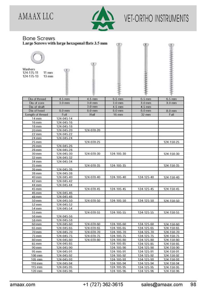 Bone Screws Large Screws with large hexagonal flats 3.5 mm Washers 124-175-11 11 mm 124-175-13 13 mm Dia of thread 4.5 mm 4.5 mm 6.5 mm 6.5 mm 6.5 mm Dia of core 3.0 mm 3.0 mm 3.0 mm 3.0 mm 3.0 mm Dia of shaft 3.0 mm 4.5 mm 4.5 mm Dia of head 8.0 mm 8.0 mm 8.0 mm 8.0 mm 8.0 mm Length of thread Full Half 16 mm 32 mm Full 14 mm 124-045-14 16 mm 124-045-16 18 mm 124-045-18 20 mm 124-045-20 124-070-20 22 mm 124-045-22 24 mm 124-045-24 25 mm 124-070-25 124-150-25 26 mm 124-045-26 28 mm 124-045-28 30 mm 124-045-30 124-070-30 124-105-30 124-150-30 32 mm 124-045-32 34 mm 124-045-34 35 mm 124-070-35 124-105-35 124-150-35 36 mm 124-045-36 38 mm 124-045-38 40 mm 124-045-40 124-070-40 124-105-40 124-125-40 124-150-40 42 mm 124-045-42 44 mm 124-045-44 45 mm 124-070-45 124-105-45 124-125-45 124-150-45 46 mm 124-045-46 48 mm 124-045-48 50 mm 124-045-50 124-070-50 124-105-50 124-125-50 124-150-50 52 mm 124-045-52 54 mm 124-045-54 55 mm 124-070-55 124-105-55 124-125-55 124-150-55 56 mm 124-045-56 58 mm 124-045-58 60 mm 124-045-60 124-070-60 124-105-60 124-125-60 124-150-60 65 mm 124-045-65 124-070-65 124-105-65 124-125-65 124-150-65 70 mm 124-045-70 124-070-70 124-105-70 124-125-70 124-150-70 75 mm 124-045-75 124-070-75 124-105-75 124-125-75 124-150-75 80 mm 124-045-80 124-070-80 124-105-80 124-125-80 124-150-80 85 mm 124-045-85 124-105-85 124-125-85 124-150-85 90 mm 124-045-90 124-105-90 124-125-90 124-150-90 95 mm 124-045-91 124-105-91 124-125-91 124-150-91 100 mm 124-045-92 124-105-92 124-125-92 124-150-92 105 mm 124-045-93 124-105-93 124-125-93 124-150-93 110 mm 124-045-94 124-105-94 124-125-94 124-150-94 115 mm 124-045-95 124-105-95 124-125-95 124-150-95 120 mm 124-045-96 124-105-96 124-125-96 124-150-96
