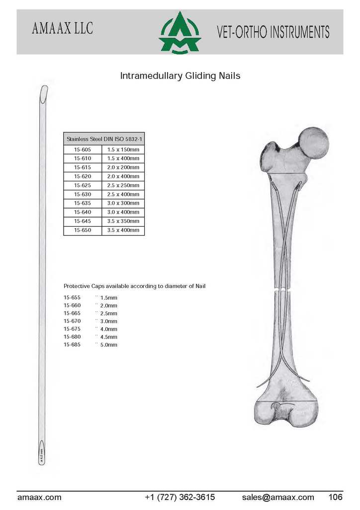 Intramedullary Gliding Nails Stainless Steel DIN ISO 5832-1 15-605 1.5 x 150mm 15-610 1.5 x 400mm 15-615 2.0 x 200mm 15-620 2.0 x 400mm 15-625 2.5 x 250mm 15-630 2.5 x 400mm 15-635 3.0 x 300mm 15-640 3.0 x 400mm 15-645 3.5 x 350mm 15-650 3.5 x 400mm Protective Caps available according to diameter of Nail 15-655 ? 1.5mm 15-660 ? 2.0mm 15-665 ? 2.5mm 15-670 ? 3.0mm 15-675 ? 4.0mm 15-680 ? 4.5mm 15-685 ? 5.0mm