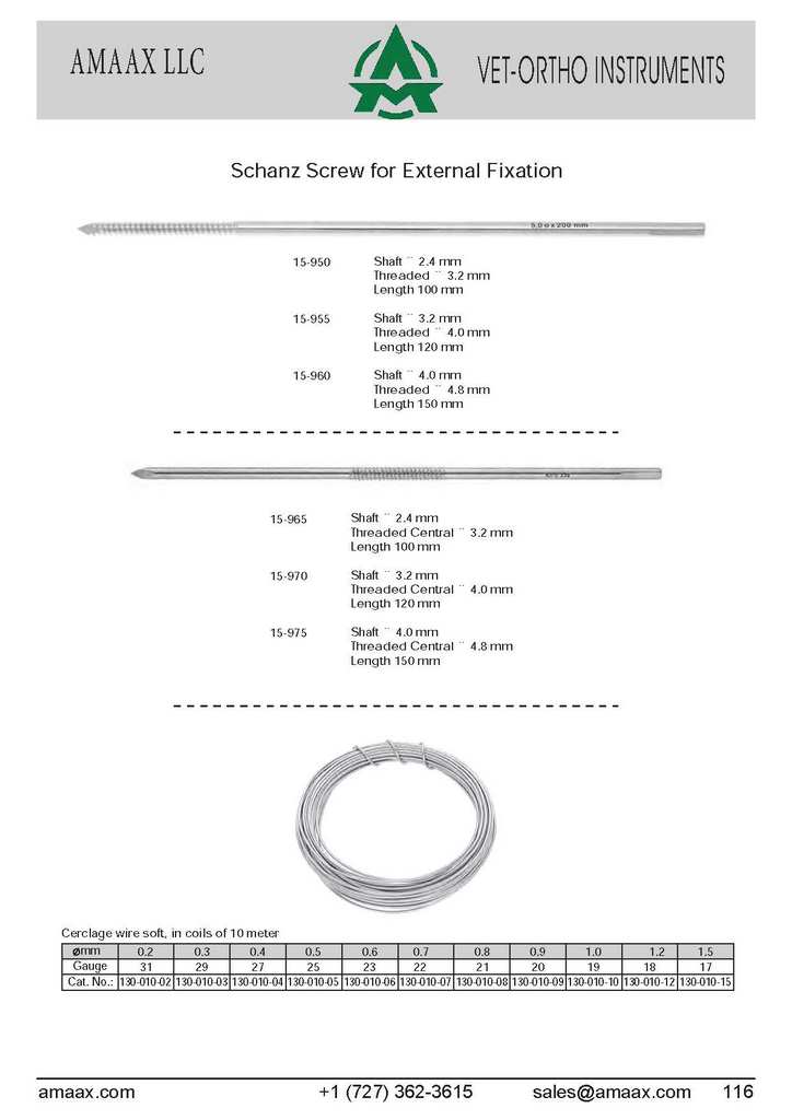 Schanz Screw for External Fixation 15-950 15-955 15-960 Shaft ? 2.4 mm Threaded ? 3.2 mm Length 100 mm Shaft ? 3.2 mm Threaded ? 4.0 mm Length 120 mm Shaft ? 4.0 mm Threaded ? 4.8 mm Length 150 mm 15-965 15-970 15-975 Shaft ? 2.4 mm Threaded Central ? Length 100 mm Shaft ? 3.2 mm Threaded Central ? Length 120 mm Shaft ? 4.0 mm Threaded Central ? Length 150 mm 3.2 mm 4.0 mm 4.8 mm Cerclage wire soft, in coils of 10 meter mm 0.2 0.3 0.4 0.5 0.6 0.7 0.8 0.9 1.0 1.2 1.5 Gauge 31 29 27 25 23 22 21 20 19 18 17 Cat. No.: 130-010-02 130-010-03 130-010-04 130-010-05 130-010-06 130-010-07 130-010-08 130-010-09 130-010-10 130-010-12 130-010-15