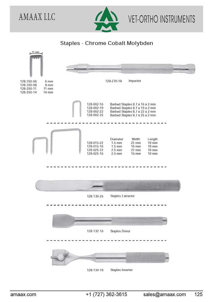 Staples -Chrome Cobalt Molybden 128-250-06 6mm 128-270-18 Impactor 128-250-08 8mm 128-250-11 11 mm 128-250-14 14 mm 128-002-16 Barbed Staples 8.7 x 16x2mm 128-002-19 Barbed Staples 8.7 x 19x2mm 128-002-22 Barbed Staples 8.7 x 22x2mm 128-002-25 Barbed Staples 8.7 x 25x2mm Diameter Width Length 128-015-22 1.5 mm 22 mm 19 mm 128-015-16 1.5 mm 16 mm 19 mm 128-025-22 2.5 mm 22 mm 19 mm 128-025-16 2.5 mm 16 mm 19 mm 128-130-25 Staples Extractor 128-132-16 Staples Driver 128-134-19 Staples Inserter