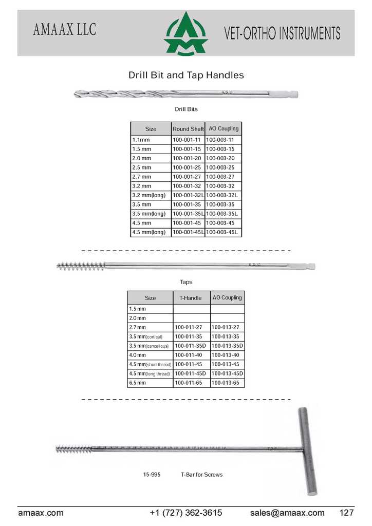 Drill Bit and Tap Handles Drill Bits Size Round Shaft AO Coupling 1.1mm 100-001-11 100-003-11 1.5 mm 100-001-15 100-003-15 2.0 mm 100-001-20 100-003-20 2.5 mm 100-001-25 100-003-25 2.7 mm 100-001-27 100-003-27 3.2 mm 100-001-32 100-003-32 3.2 mm(long) 100-001-32L 100-003-32L 3.5 mm 100-001-35 100-003-35 3.5 mm(long) 100-001-35L 100-003-35L 4.5 mm 100-001-45 100-003-45 4.5 mm(long) 100-001-45L 100-003-45L Taps Size T-Handle AO Coupling 1.5 mm 2.0 mm 2.7 mm 100-011-27 100-013-27 3.5 mm(cortical) 100-011-35 100-013-35 3.5 mm(cancellous) 100-011-35D 100-013-35D 4.0 mm 100-011-40 100-013-40 4.5 mm(short thread) 100-011-45 100-013-45 4.5 mm(long thread) 100-011-45D 100-013-45D 6.5 mm 100-011-65 100-013-65