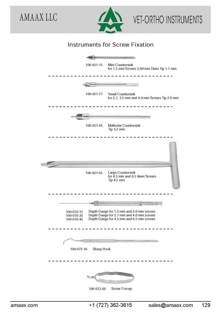 Instruments for Screw Fixation 100-021-15 Mini Countersink for 1.5 mm Screws 2.00 mm Diam Tip 1.1 mm 100-021-27 Small Countersink for 2.7, 3.5 mm and 4.0 mm Screws Tip 2.0 mm 100-021-45 Malleolar Countersink Tip 3.2 mm 100-021-65 Large Countersink for 4.5 mm and 6.5 diam Screws Tip 4.5 mm 100-070-15 Depth Gauge for 1.5 mm and 2.0 mm screws 100-070-35 Depth Gauge for 2.7 mm and 4.0 mm screws 100-070-45 Depth Gauge for 4.5 mm and 6.5 mm screws 100-073-16 Sharp Hook 100-072-02 Screw Forcep