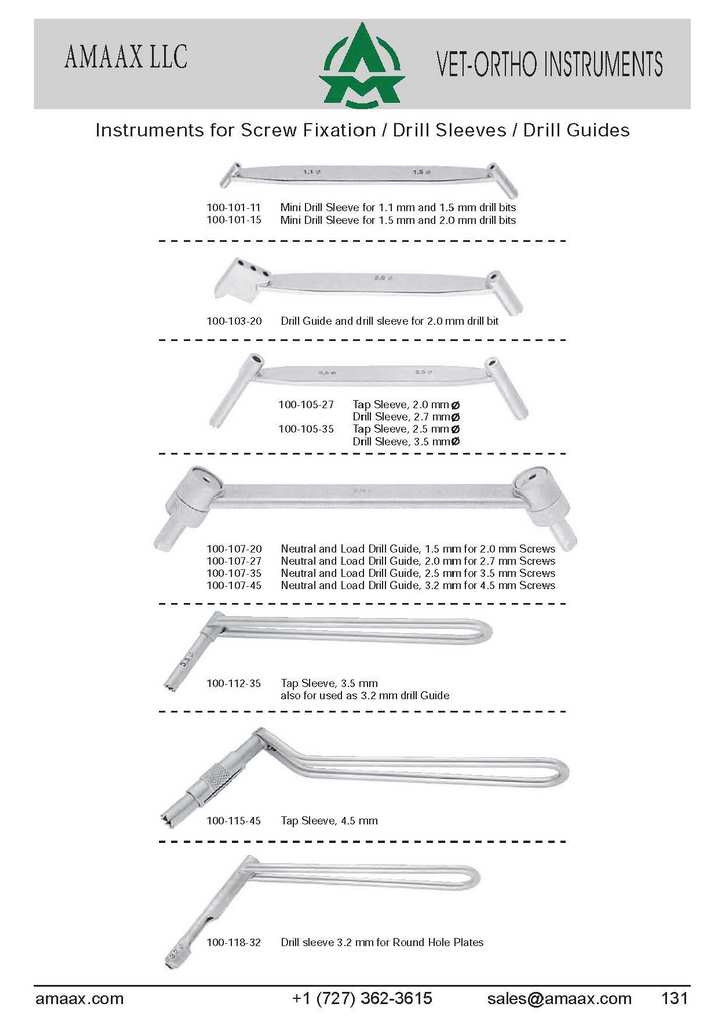 Instruments for Screw Fixation / Drill Sleeves / Drill Guides 100-101-11 Mini Drill Sleeve for 1.1 mm and 1.5 mm drill bits 100-101-15 Mini Drill Sleeve for 1.5 mm and 2.0 mm drill bits 100-103-20 Drill Guide and drill sleeve for 2.0 mm drill bit 100-105-27 Tap Sleeve, 2.0 mm Drill Sleeve, 2.7 mm 100-105-35 Tap Sleeve, 2.5 mm Drill Sleeve, 3.5 mm 100-107-20 Neutral and Load Drill Guide, 1.5 mm for 2.0 mm Screws 100-107-27 Neutral and Load Drill Guide, 2.0 mm for 2.7 mm Screws 100-107-35 Neutral and Load Drill Guide, 2.5 mm for 3.5 mm Screws 100-107-45 Neutral and Load Drill Guide, 3.2 mm for 4.5 mm Screws 100-118-32 Drill sleeve 3.2 mm for Round Hole Plates