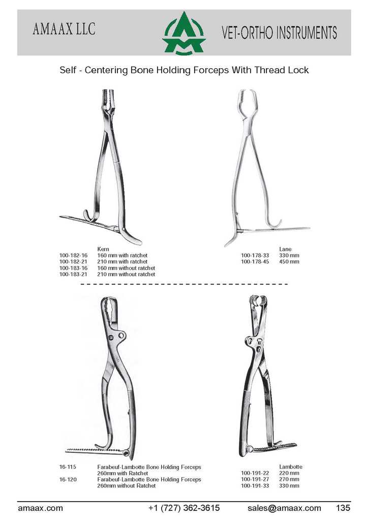 Self -Centering Bone Holding Forceps With Thread Lock Kern Lane 100-182-16 160 mm with ratchet 100-178-33 330 mm 100-182-21 210 mm with ratchet 100-178-45 450 mm 100-183-16 160 mm without ratchet 100-183-21 210 mm without ratchet 16-115 Farabeuf-Lambotte Bone Holding Forceps Lambotte 260mm with Ratchet 100-191-22 220 mm 16-120 Farabeuf-Lambotte Bone Holding Forceps 100-191-27 270 mm 260mm without Ratchet 100-191-33 330 mm
