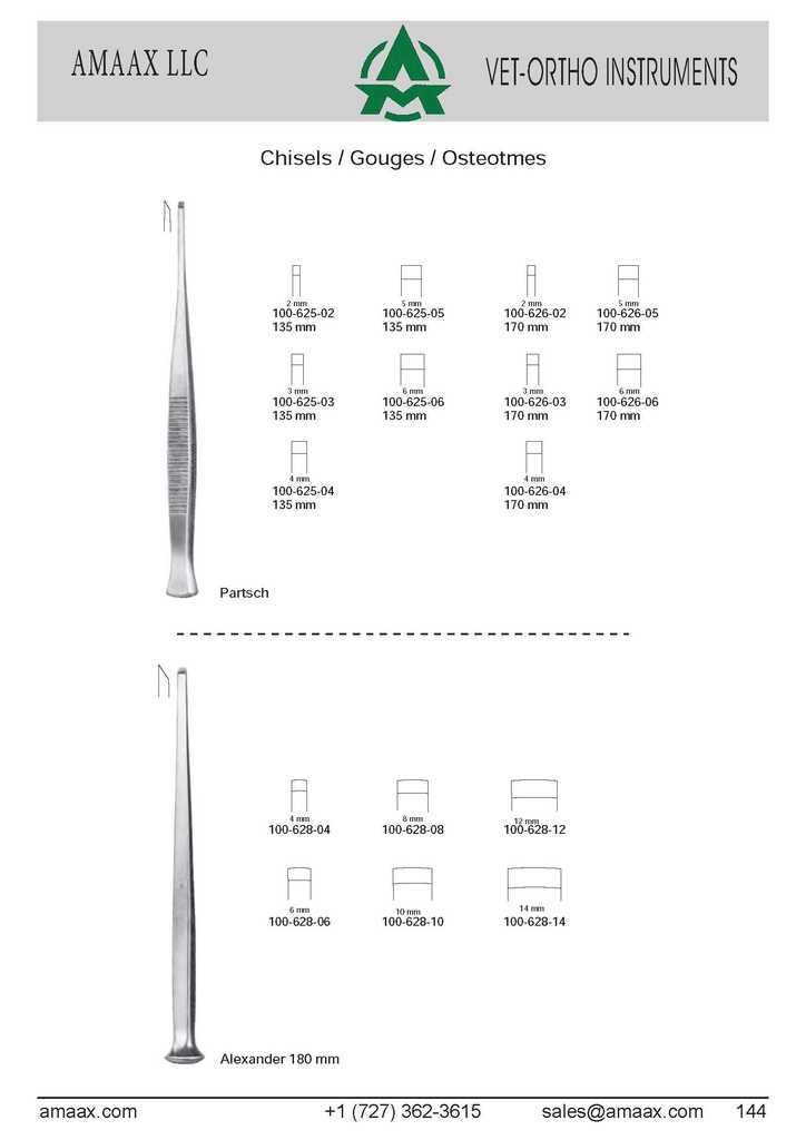 Chisels / Gouges / Osteotmes 2mm 5mm 2mm 5mm 100-625-02 100-625-05 100-626-02 100-626-05 135 mm 135 mm 170 mm 170 mm 3mm 6mm 3mm 6mm 100-625-03 100-625-06 100-626-03 100-626-06 135 mm 135 mm 170 mm 170 mm 4mm 4mm 100-625-04 100-626-04 135 mm 170 mm Partsch 4mm 8mm 12 mm 100-628-04 100-628-08 100-628-12 14 mm 6mm 10 mm 100-628-06 100-628-10 100-628-14 Alexander 180 mm