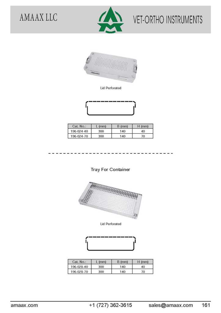 Lid Perforated Cat. No.: L (mm) B (mm) H (mm) 196-024-40 300 140 40 196-024-70 300 140 70 Tray For Container Lid Perforated Cat. No.: L (mm) B (mm) H (mm) 196-028-40 300 140 40 196-028-70 300 140 70