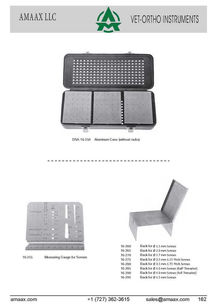 DSA-16-250 Aluminum Case (without racks) 16-255 Measuring Gauge for Screws 16-260 Rack for ? 1.5 mm Screws 16-265 Rack for ? 2.0 mm Screws 16-270 Rack for ? 2.7 mm Screws 16-275 Rack for ? 3.5 mm 1.25 Pitch Screws 16-280 Rack for ? 3.5 mm 1.75 Pitch Screws 16-285 Rack for ? 4.0 mm Screws (half Threaded) 16-290 Rack for ? 4.0 mm Screws (full Threaded) 16-295 Rack for ? 4.5 mm Screws